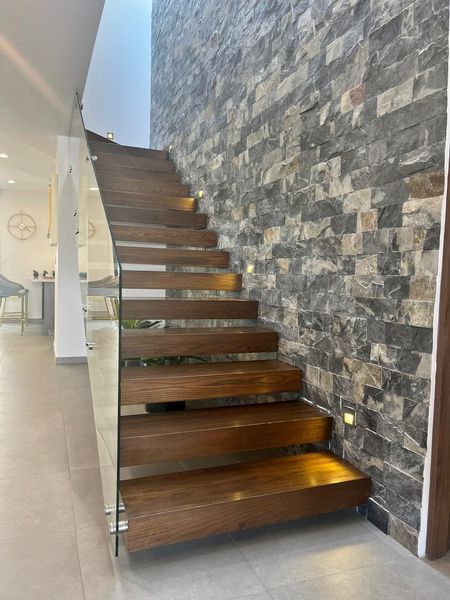 Cristales templados en Barandal y escalera volada con huella de encino americano